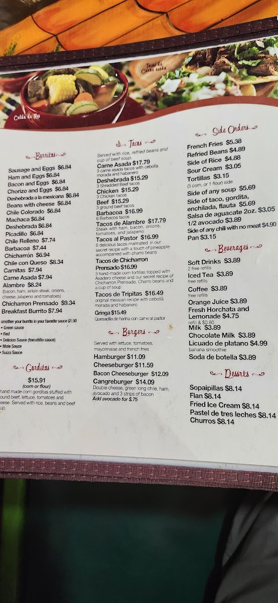 3 handmade corn gorditas stuffed with ground beef, lettuce, tomatoes, and cheese. Served with rice, beans and beef soup.